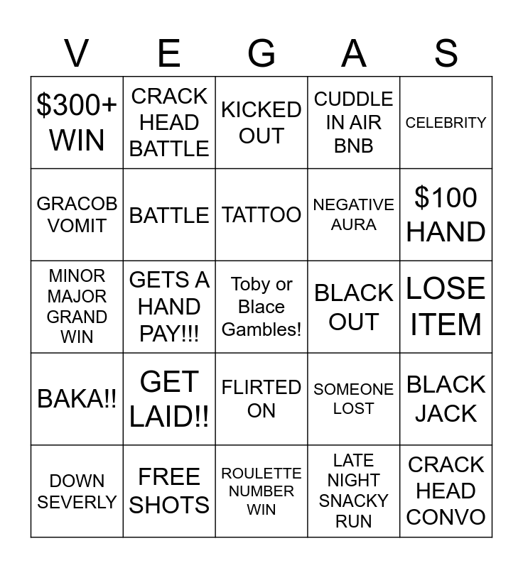 This bingo card has a free space and 24 words: GET LAID!!, FREE SHOTS, TATTOO, DOWN SEVERLY, CELEBRITY, $300+ WIN, GRACOB VOMIT, CRACK HEAD BATTLE, BLACK OUT, FLIRTED ON, NEGATIVE AURA, MINOR MAJOR GRAND WIN, SOMEONE LOST, BLACK JACK, BATTLE, LATE NIGHT SNACKY RUN, LOSE ITEM, KICKED OUT, $100 HAND, GETS A HAND PAY!!!, CRACK HEAD CONVO, BAKA!!, CUDDLE IN AIR BNB and ROULETTE NUMBER WIN.