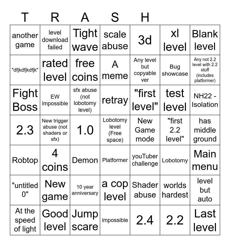 This bingo card has a free space and 48 words: Shader abuse, Bug showcase, impossible, New trigger abuse (not shaders or sfx), sfx abuse (not lobotomy level), has middle ground, level download failed, Good level, xl level, Platformer, Blank level, scale abuse, test level, "first level", "untitled 0", "first 2.2 level", "dfjkdfjkdfjk", Any not 2.2 level with 2.2 stuff (includes platformer), worlds hardest, 3d, Any level but copyable ver, 1.0, another game, rated level, level but auto, free coins, NH22 - Isolation, At the speed of light, retray, EW impossible, 2.2, New Game mode, Main menu, New game, 2.3, youTuber challenge, Lobotomy, Fight Boss, Demon, 10 year anniversary, Robtop, Last level, Tight wave, Jump scare, A meme, a cop level, 4 coins and 2.4.