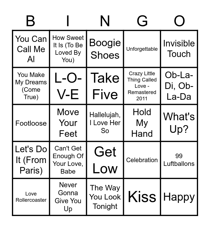This bingo card has a free space and 47 words: Father and Daughter, Happy, Ain't No Mountain High Enough, The Way You Look Tonight, Can't Get Enough Of Your Love, Babe, Crazy Love, How Sweet It Is (To Be Loved By You), I Wanna Dance with Somebody (Who Loves Me), You Make My Dreams (Come True), I Can't Help Myself (Sugar Pie, Honey Bunch), L-O-V-E, Unforgettable, 99 Luftballons, Celebration, Best of My Love, Swingin', Take Five, Hold My Hand, Shout, Pts. 1 & 2, Invisible Touch, Move Your Feet, Kiss, You Can Call Me Al, Crazy Little Thing Called Love - Remastered 2011, When I'm Sixty Fou, Ob-La-Di, Ob-La-Da, Love Rollercoaster, Lady Marmalade - From Moulin Rouge Soundtrack, Get Low, Let's Do It (From Paris), One Way Or Another, Hanging On The Telephone, I Believe in a Thing Called Love, Don't Stop 'Til You Get Enough, Don't Stop - 2004 Remaster, Never Gonna Give You Up, What's Up?, Cotton Eye Joe, We Will Rock You, Old Time Rock & Roll, Got To Give It Up - Pt. 1, Boogie Shoes, Footloose, Come Away With Me, Storybook Love, All The Small Things and Copperhead Road.