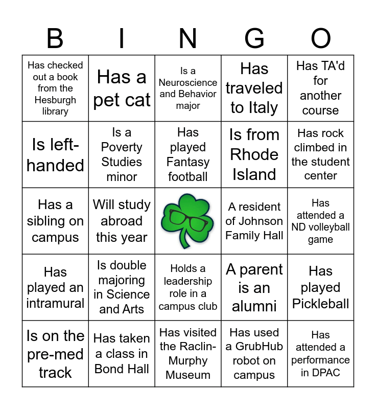 This bingo card has a free space and 29 words: Is on the pre-med track, Is a "Gateway" student, Will study abroad this year, Is a chemistry minor, Has checked out a book from the Hesburgh library, Is a Neuroscience and Behavior major, Is a Poverty Studies minor, Is double majoring in Science and Arts, A resident of Johnson Family Hall, Has taken a class in Bond Hall, Has attended a ND volleyball game, Has attended a performance in DPAC, Has visited the Raclin-Murphy Museum, Has used a GrubHub robot on campus, Has rock climbed in the student center, Is a Dorm RA, Holds a leadership role in a campus club, Has played an intramural, Has TA'd for another course, Has a sibling on campus, A parent is an alumni, Is from California, Is from Rhode Island, Is left-handed, Has traveled to Italy, Has a pet cat, Has played Pickleball, Has played Fantasy football and Has read Romeo and Juliet.