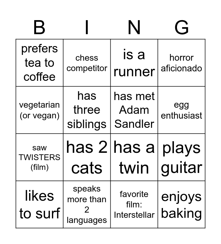 This bingo card has 19 words: has a twin, prone to seasickness, is a runner, enjoys baking, plays guitar, vegetarian (or vegan), favorite film: Interstellar, prefers tea to coffee, chess competitor, saw TWISTERS (film), has 2 cats, has three siblings, has met Adam Sandler, speaks more than 2 languages, likes to surf, collects vinyl records, horror aficionado, egg enthusiast and fluent in French.