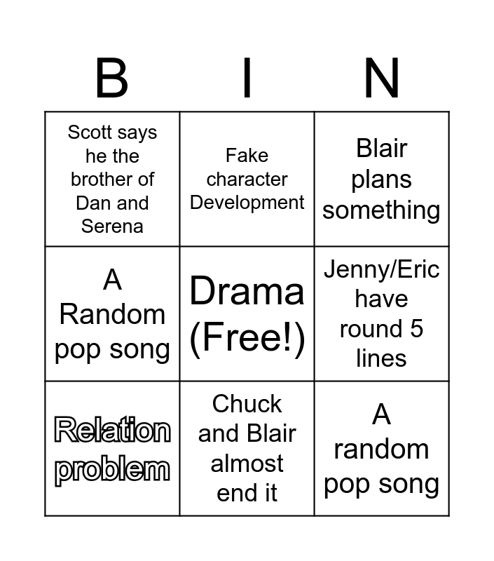 This bingo card has a free space and 9 words: Relation problem, Blair plans something, Fake character Development, A Random pop song, Scott says he the brother of Dan and Serena, Jenny/Eric have round 5 lines, A random pop song, A party and Chuck and Blair almost end it.
