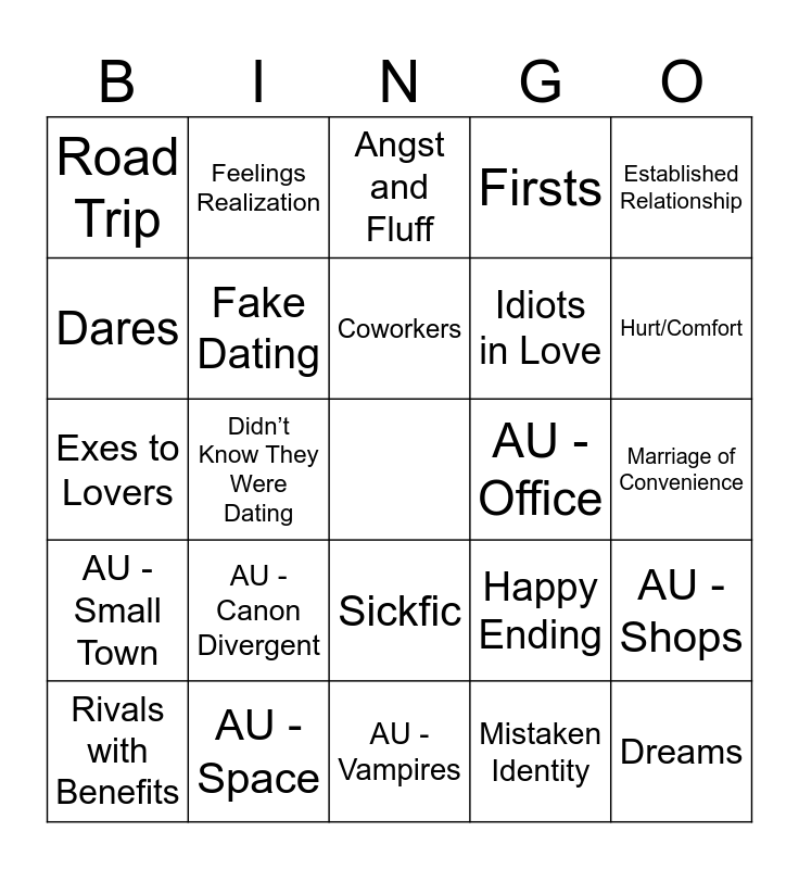 This bingo card has a free space and 77 words: 3+1 / 5+1 Times, Angst, Angst and Fluff, Animals / Pets, Arranged Marriage, Based on Other Media, Blind Date, Canon Compliant, Celestial Beings, Childhood Friends, Childhood Sweethearts, Confessions, Coworkers, Dares, Domesticity, Didn’t Know They Were Dating, Different Time Period, Dreams, Enemies / Rivals to Lovers, Established Relationship, Exes, Exes to Lovers, Fake Dating, Feelings Realization, Firsts, Fluff, Food / Cooking, Forbidden Love, Found Family, Friends With Benefits, Friends to Lovers, Ghosts / Paranormal, Handholding, Happy Ending, Hurt/Comfort, Idiots in Love, Magic, Marriage / Married Life / Weddings, Marriage of Convenience, Mistaken Identity, Mutual Pining, Nature Imagery, Neighbors, One Night Stands, Partners in Crime, Pining, Rivals with Benefits, Road Trip, Roommates, Secret Admirer, Sharing a Bed, Sickfic, Slice of Life, Slow Burn, Soulmates, Strangers to Lovers, Supernatural Elements, Time (Travel, Loops, etc.), Trapped Together, AU - Bodyguard, AU - Canon Divergent, AU - College / University, AU - Fantasy, AU - Inspired by SKZ MV, AU - Modern, AU - Modern with Magic, AU - Non-Idol Celebrity, AU - Office, AU - Reincarnation, AU - Rock Band, AU - Royalty, AU - Shops, AU - Small Town, AU - Space, AU - Spies / Secret Agents, AU - Vampires and AU - Werewolves.
