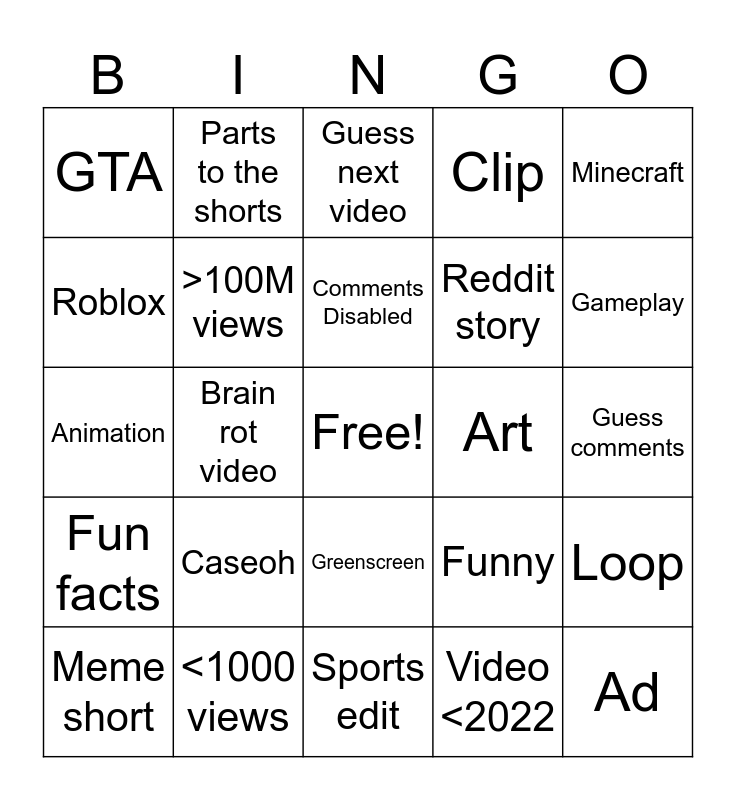 This bingo card has a free space and 24 words: Caseoh, <1000 views, Comments Disabled, Meme short, Minecraft, GTA, Roblox, Parts to the shorts, Art, Greenscreen, Reddit story, Animation, Funny, Loop, >100M views, Video <2022, Guess comments, Guess next video, Gameplay, Brain rot video, Ad, Fun facts, Clip and Sports edit.