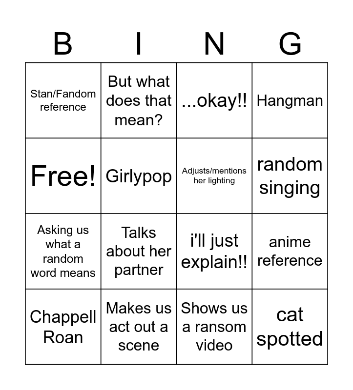 This bingo card has 16 words: Makes us act out a scene, anime reference, ...okay!!, Stan/Fandom reference, Asking us what a random word means, But what does that mean?, i'll just explain!!, Shows us a ransom video, Free!, Girlypop, Chappell Roan, Hangman, Talks about her partner, random singing, Adjusts/mentions her lighting and cat spotted.