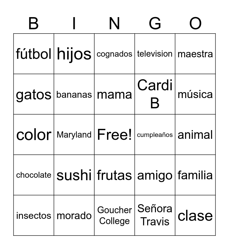 This bingo card has a free space and 25 words: sushi, Goucher College, mama, insectos, maestra, fútbol, gatos, hijos, cumpleaños, frutas, Cardi B, color, amigo, familia, bananas, febrero, animal, cognados, música, Maryland, clase, morado, chocolate, television and Señora Travis.