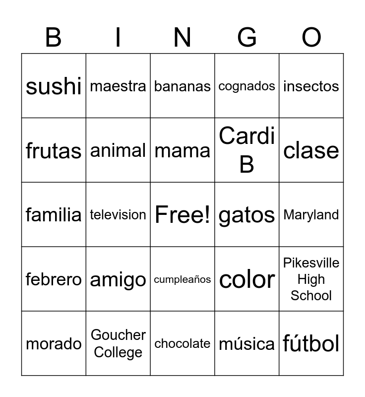This bingo card has a free space and 24 words: amigo, Goucher College, mama, morado, insectos, sushi, frutas, maestra, gatos, cumpleaños, Cardi B, familia, color, Pikesville High School, animal, música, Maryland, bananas, clase, television, fútbol, febrero, cognados and chocolate.