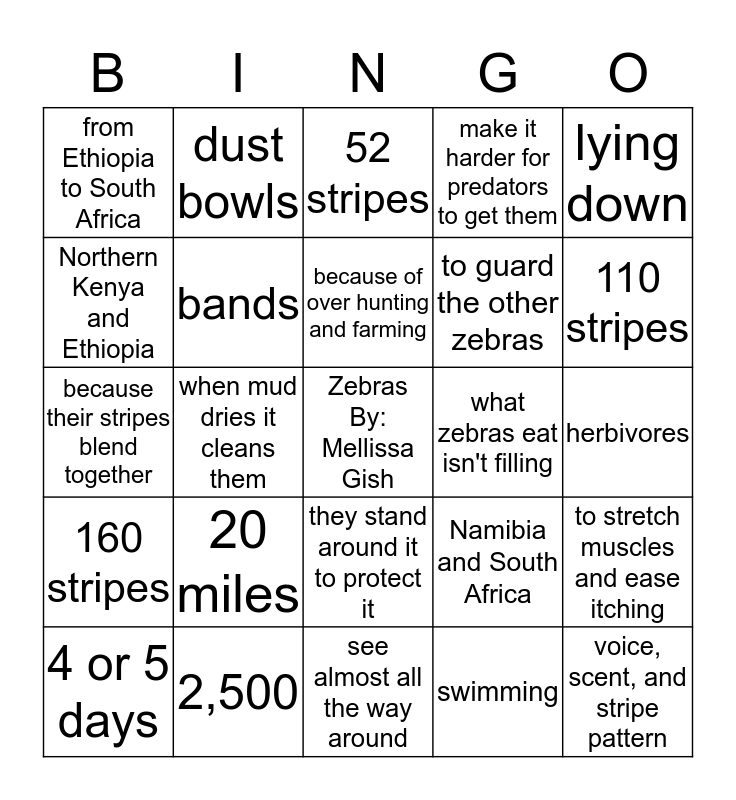 This bingo card has a free space and 24 words: 20 miles, 2,500, because of over hunting and farming, 4 or 5 days, lying down, from Ethiopia to South Africa, Northern Kenya and Ethiopia, dust bowls, what zebras eat isn't filling, they stand around it to protect it, to guard the other zebras, because their stripes blend together, Namibia and South Africa, to stretch muscles and ease itching, bands, swimming, herbivores, 52 stripes, 110 stripes, when mud dries it cleans them, voice, scent, and stripe pattern, 160 stripes, make it harder for predators to get them and see almost all the way around.