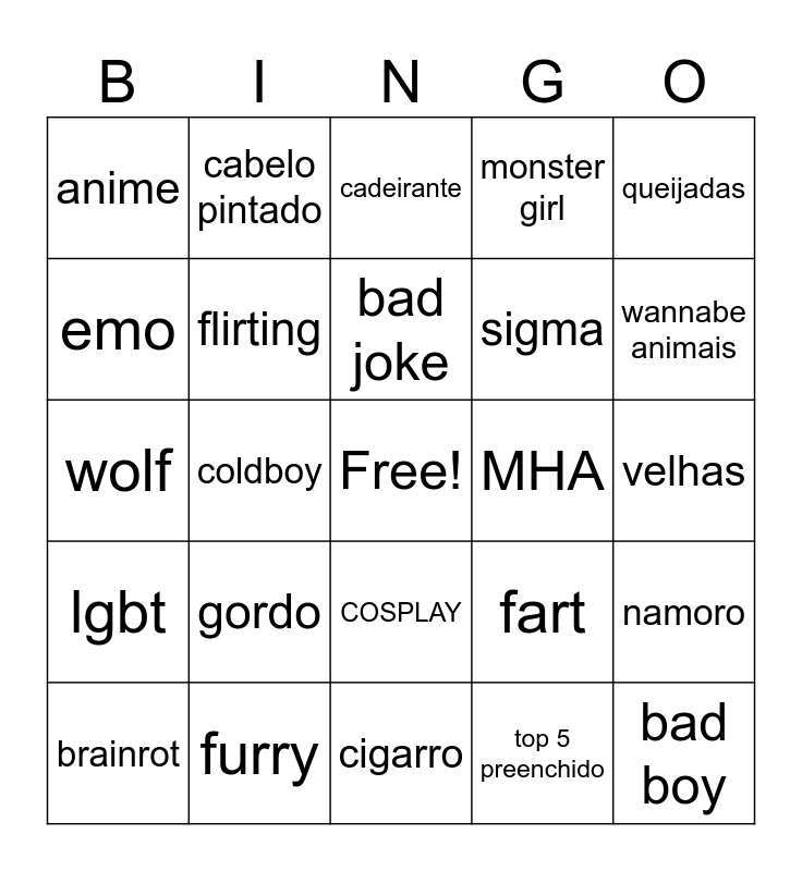 This bingo card has a free space and 24 words: gordo, furry, bad joke, brainrot, queijadas, anime, emo, cabelo pintado, MHA, COSPLAY, sigma, wolf, fart, namoro, flirting, top 5 preenchido, velhas, cadeirante, wannabe animais, coldboy, bad boy, lgbt, monster girl and cigarro.