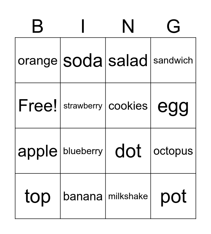 This bingo card has 16 words: banana, octopus, salad, orange, apple, soda, dot, milkshake, Free!, strawberry, top, sandwich, blueberry, egg, cookies and pot.