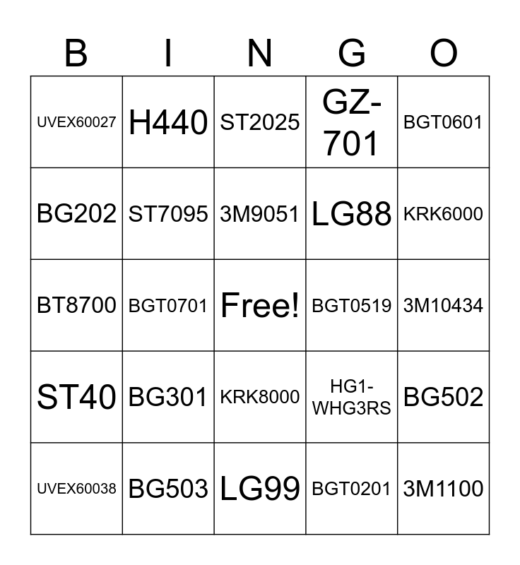 This bingo card has a free space and 24 words: BG301, BG503, 3M9051, UVEX60038, BGT0601, UVEX60027, BG202, H440, BGT0519, KRK8000, LG88, BT8700, HG1-WHG3RS, BG502, ST7095, BGT0201, 3M10434, ST2025, KRK6000, BGT0701, 3M1100, ST40, GZ-701 and LG99.