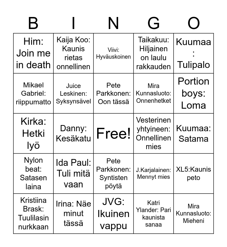 This bingo card has a free space and 45 words: Portion boys: Vauhti kiihtyy, Mira Kunnasluoto: Mieheni, Mikael Gabriel: LOVE, Kristiina Brask: Tuulilasin nurkkaan, Mirella: Timanttei, Katri Ylander: Pari kaunista sanaa, Viivi: Hyväuskoinen, Kirsi Ranto: Soitellaan, Kuumaa : Tulipalo, Irina: Näe minut tässä, Taikakuu: Hiljainen on laulu rakkauden, Vesterinen yhtyineen: Onnellinen mies, Pete Parkkonen: Syntisten pöytä, Ida Paul: Tuli mitä vaan, Laura Voutilainen: Miks ei, JVG: Ikuinen vappu, Kikka: Apinamies, Kirka: Hetki lyö, Ida Paul: Säätöö, Portion boys: Loma, Kaija Koo: Kaunis rietas onnellinen, Cheek:Sokka irti, Kristiina Brask: viileää, Him: Join me in death, Lordi: Hard rock Hallelujah, Kuumaa: Satama, Taikakuu: Satu meidän rakkauden, Vesterinen yhtyineen: Kohti sydänpeltoja, J.Karjalainen: Mennyt mies, Nylon beat: Satasen laina, Erika Vikman: Cicciolina, XL5:Kaunis peto, Rauli Badding: tähdet tähdet, Kirsi Ranto: En sua mielestäni saa, Viivi: Ihana kipu, Danny: Kesäkatu, Indica: Ikuinen virta, Popeda:Kersantti karoliina, Leevi and the leavings: Teuvo maanteiden kuningas, Pete Parkkonen: Oon tässä, Mikael Gabriel: riippumatto, Mira Kunnasluoto: Onnenhetket, Katri Ylander: Täydellinen mulle, Juice Leskinen: Syksynsävel and Celine Dion: My heart will go on.