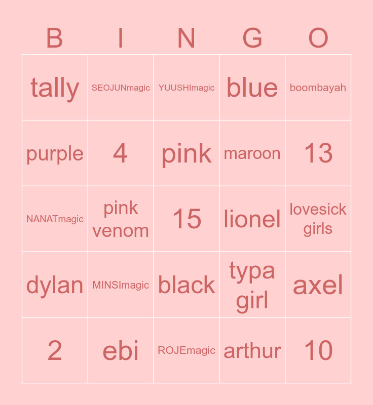 This bingo card has a free space and 24 words: MINSImagic, ebi, pink, 2, boombayah, tally, purple, SEOJUNmagic, lionel, black, maroon, NANATmagic, typa girl, axel, 4, arthur, lovesick girls, YUUSHImagic, 13, pink venom, 10, dylan, blue and ROJEmagic.