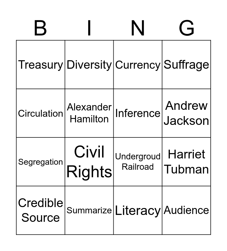 This bingo card has a free space and 15 words: Credible Source, Audience, Currency, Treasury, Andrew Jackson, Circulation, Civil Rights, Literacy, Alexander Hamilton, Segregation, Harriet Tubman, Suffrage, Inference, Diversity and Summarize.
