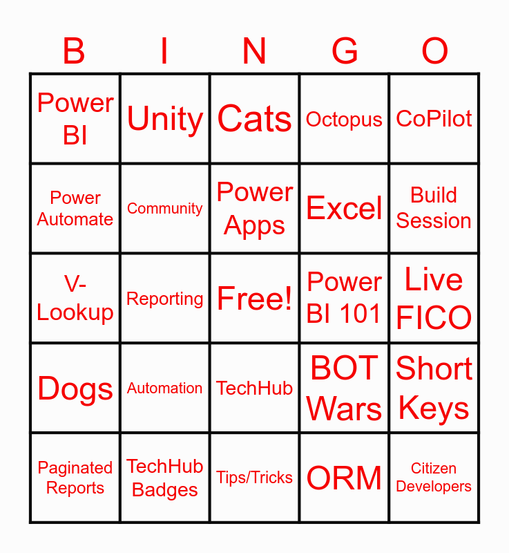 This bingo card has a free space and 26 words: TechHub, ORM, Power Apps, TechHub Badges, CoPilot, Power BI, Power Automate, Unity, Live FICO, BOT Wars, Excel, V-Lookup, Short Keys, Paginated Reports, Reporting, BORA, Octopus, Dogs, Cats, Citizen Developers, Build Session, Tips/Tricks, Power BI 101, Automation, Community and Filters.