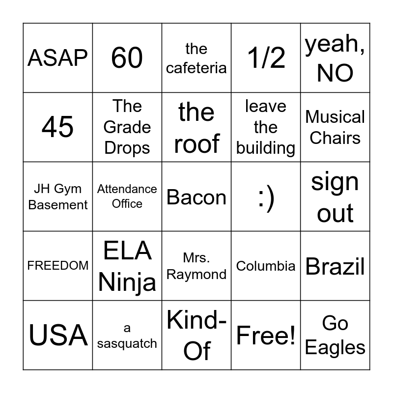 This bingo card has 30 words: a sasquatch, Google Classroom, Attendance Office, Non-Contact Sport, ASAP, the cafeteria, The Grade Drops, Mrs. Raymond, :), Kind-Of, sign out, Bacon, Free!, Go Eagles, Musical Chairs, Mr. Baker, Columbia, FREEDOM, ELA Ninja, yeah, NO, JH Gym Basement, Use Good Judgment, 60, leave the building, 45, 1/2, Brazil, USA, the roof and the Batfan.