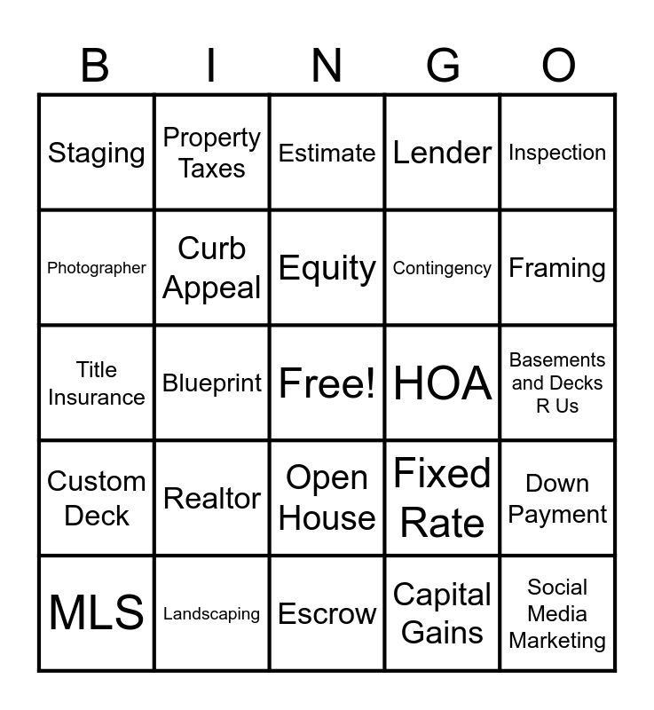 This bingo card has a free space and 25 words: Realtor, Escrow, Equity, MLS, Inspection, Staging, Photographer, Property Taxes, HOA, Open House, Contingency, Title Insurance, Fixed Rate, Down Payment, Curb Appeal, Success Realty Experts, Basements and Decks R Us, Estimate, Framing, Blueprint, Social Media Marketing, Landscaping, Custom Deck, Lender and Capital Gains.