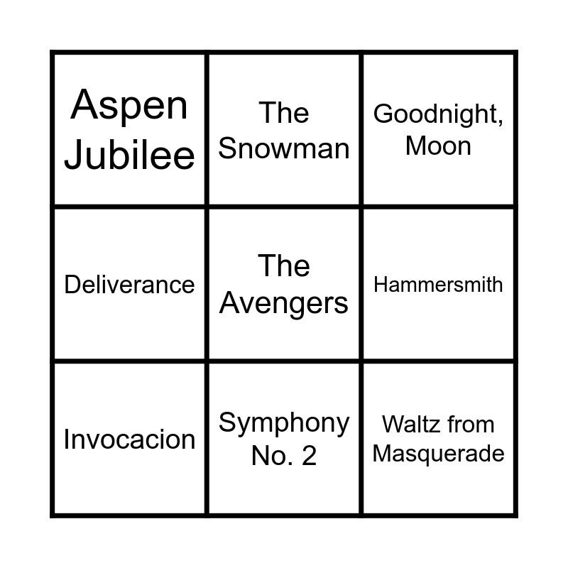 This bingo card has 15 words: Irish Tune from County Derry, Voices Shouting Out, Goodnight, Moon, Aspen Jubilee, Symphony No. 2, The Avengers, Bright Shadow Fanfare, Masquerade, Hammersmith, Waltz from Masquerade, Conversations with the Night, Deliverance, Invocacion, The Snowman and A Chorus Loud & Strong.