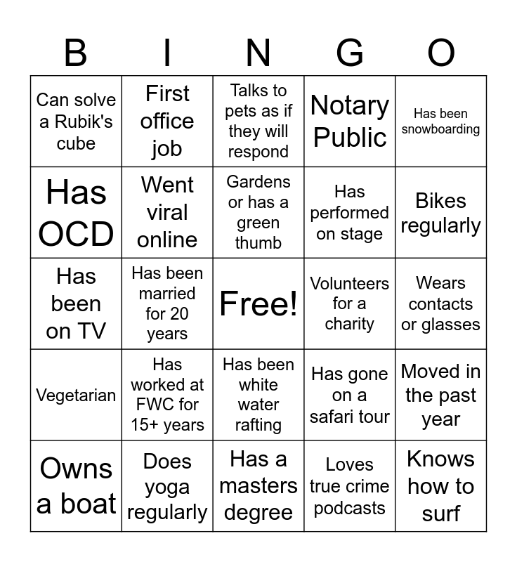 This bingo card has a free space and 24 words: Has worked at FWC for 15+ years, Does yoga regularly, Gardens or has a green thumb, Owns a boat, Has been snowboarding, Can solve a Rubik's cube, Has OCD, First office job, Volunteers for a charity, Has been white water rafting, Has performed on stage, Has been on TV, Has gone on a safari tour, Moved in the past year, Went viral online, Loves true crime podcasts, Wears contacts or glasses, Talks to pets as if they will respond, Bikes regularly, Has been married for 20 years, Knows how to surf, Vegetarian, Notary Public and Has a masters degree.