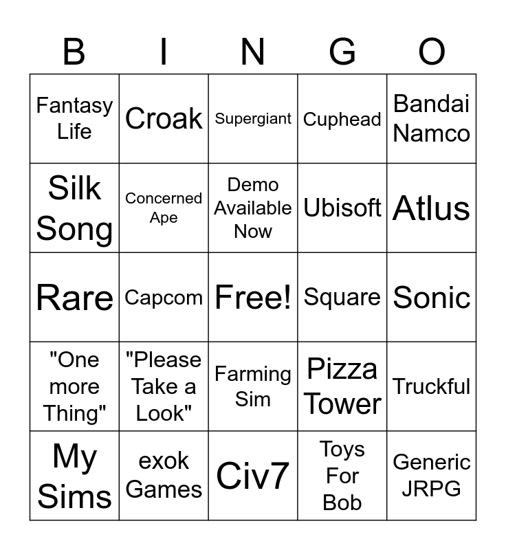This bingo card has a free space and 29 words: My Sims, Spooky Game, Capcom, Hello Kitty Island Adventure, Fantasy Life, Supergiant, Concerned Ape, "Please Take a Look", Square, exok Games, Sonic, Generic JRPG, Civ7, Toys For Bob, Atlus, Sizzle Reel, Farming Sim, "One more Thing", Bandai Namco, Rare, Pizza Tower, Releasing Later Today, Ubisoft, Silk Song, Cuphead, Croak, Truckful, Demo Available Now and "So What Did You Think?.