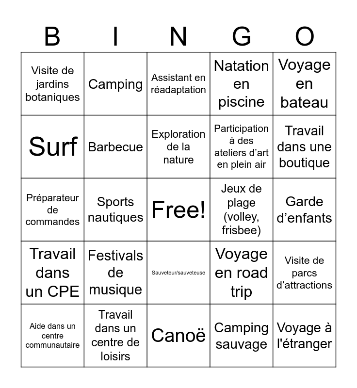 This bingo card has a free space and 50 words: Plage, Voyage à l'étranger, Escalade, Canoë, Festivals de musique, Randonnée, Camping, Vélo en plein air, Surf, Pique-nique, Barbecue, Natation en piscine, Visite de parcs d’attractions, Voyage en road trip, Activités de plein air en famille, Observation des étoiles, Exploration de la nature, Jeux de plage (volley, frisbee), Dégustation de glaces, Voyage en bateau, Sports nautiques, Camping sauvage, Visite de jardins botaniques, Participation à des ateliers d’art en plein air, Visite de marchés locaux, Travail dans un pet shop, Travail dans une boutique, Travail dans un spa, Assistant en réadaptation, Sauveteur/sauveteuse, Travail sur une ferme, Serveur/serveuse, Caissier/caissière, Animateur de camps de jour, Travail dans un centre de loisirs, Tutorat pour enfants, Travail dans une bibliothèque, Assistant dans un musée, Travail dans une cafétéria, Garde d’enfants, Nettoyage de jardins, Guide touristique, Réceptionniste d’hôtel, Travail dans une pâtisserie, Aide dans un centre communautaire, Préparateur de commandes, Travail dans un centre sportif, Assistant en recherche universitaire, Travail dans un CPE and Vendeur dans une foire ou un marché.