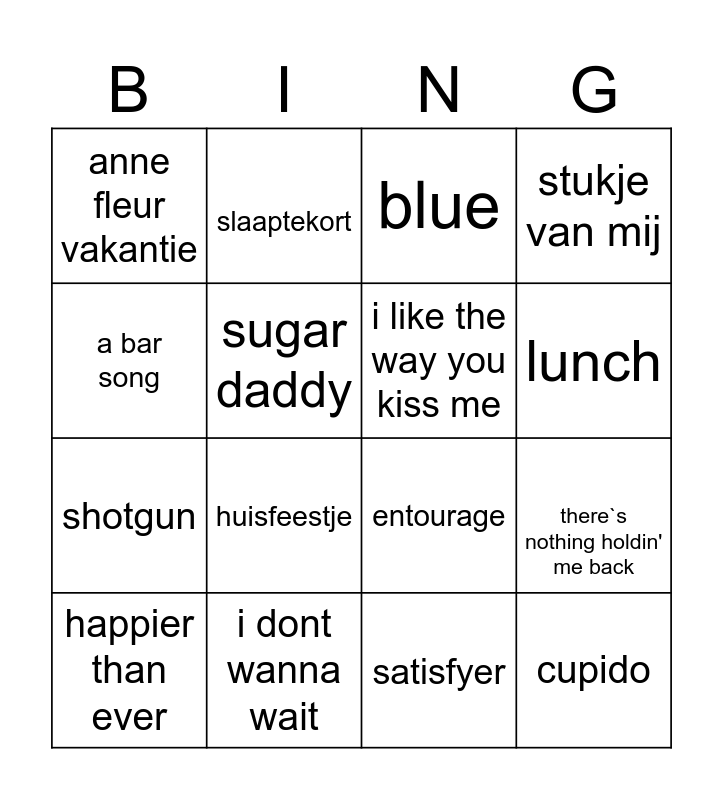 This bingo card has 20 words: there`s nothing holdin' me back, illusion, blue, stitches, happier than ever, a bar song, i dont wanna wait, anne fleur vakantie, shotgun, slaaptekort, huisfeestje, entourage, sugar daddy, cupido, i like the way you kiss me, beautiful things, lunch, stukje van mij, satisfyer and gaan we weg.