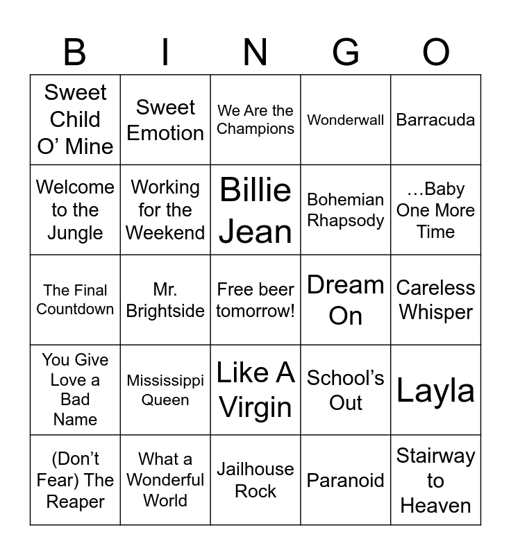 This bingo card has a free space and 53 words: Sweet Home Alabama, Stairway to Heaven, Free Bird, Paranoid, Mississippi Queen, Hot for Teacher, Sweet Emotion, Carry on Wayward Son, Welcome to the Jungle, Bad to the Bone, Working for the Weekend, Any Way You Want It, Layla, School’s Out, Money, (Don’t Fear) The Reaper, Billie Jean, Dream On, Hotel California, Barracuda, Mr. Brightside, Smells Like Teen Spirit, Bohemian Rhapsody, Sweet Child O’ Mine, Rock and Roll All Nite, What a Wonderful World, Never Gonna Give You Up, Stayin Alive, Dancing Queen, …Baby One More Time, Eye of the Tiger, My Heart Will Go On, Beat It, Lose Yourself, Girls Just Want to Have Fun, Wannabe, Wonderwall, Jailhouse Rock, We Are the Champions, Livin’ La Vida Loca, U Can’t Touch This, Take On Me, Careless Whisper, Sweet Caroline, Seven Nation Army, Like A Virgin, You Shook Me All Night Long, We Didn’t Start the Fire, The Final Countdown, You Give Love a Bad Name, Kung Fu Fighting, I’ll Be There For You and Purple Haze.