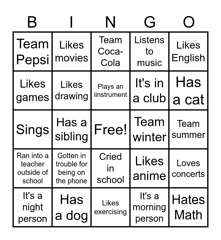 This bingo card has a free space and 24 words: Gotten in trouble for being on the phone, Has a dog, Plays an iinstrument, It's a night person, Likes English, Team Pepsi, Likes games, Likes movies, Team winter, Cried in school, It's in a club, Sings, Likes anime, Loves concerts, Likes drawing, It's a morning person, Team summer, Team Coca-Cola, Has a cat, Has a sibling, Hates Math, Ran into a teacher outside of school, Listens to music and Likes exercising.
