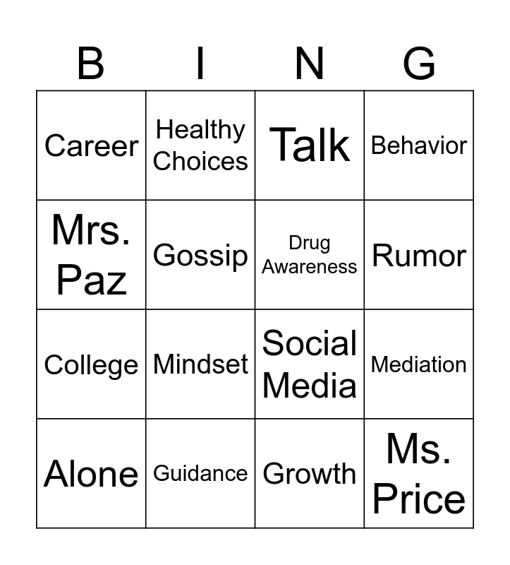 This bingo card has 16 words: Guidance, Mediation, Talk, Career, College, Healthy Choices, Social Media, Growth, Mrs. Paz, Gossip, Alone, Behavior, Mindset, Rumor, Drug Awareness and Ms. Price.