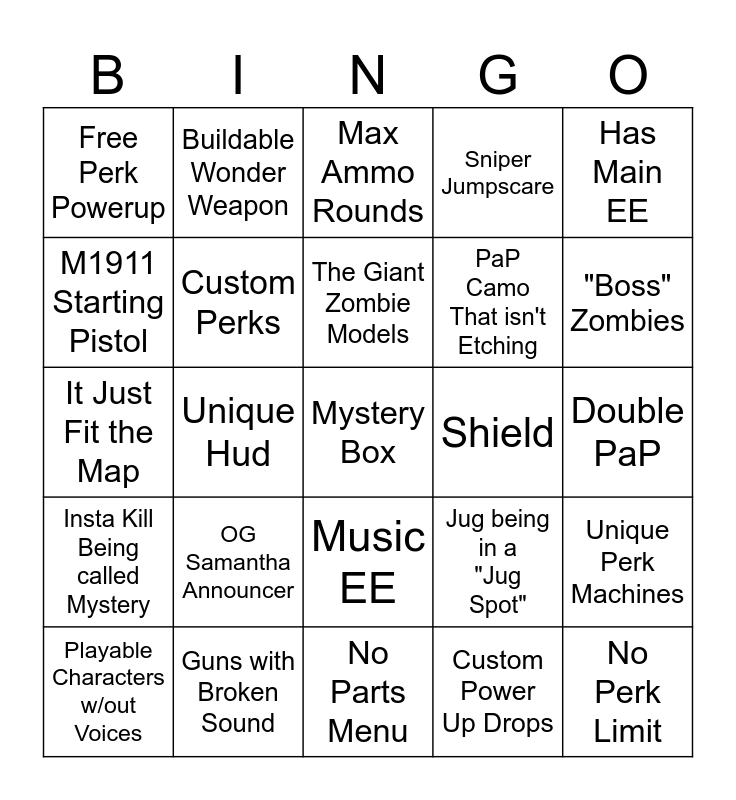 This bingo card has a free space and 24 words: OG Samantha Announcer, Guns with Broken Sound, The Giant Zombie Models, Playable Characters w/out Voices, Has Main EE, Free Perk Powerup, M1911 Starting Pistol, Buildable Wonder Weapon, Shield, Music EE, PaP Camo That isn't Etching, It Just Fit the Map, Jug being in a "Jug Spot", Unique Perk Machines, Custom Perks, Custom Power Up Drops, Double PaP, Max Ammo Rounds, "Boss" Zombies, Unique Hud, No Perk Limit, Insta Kill Being called Mystery, Sniper Jumpscare and No Parts Menu.