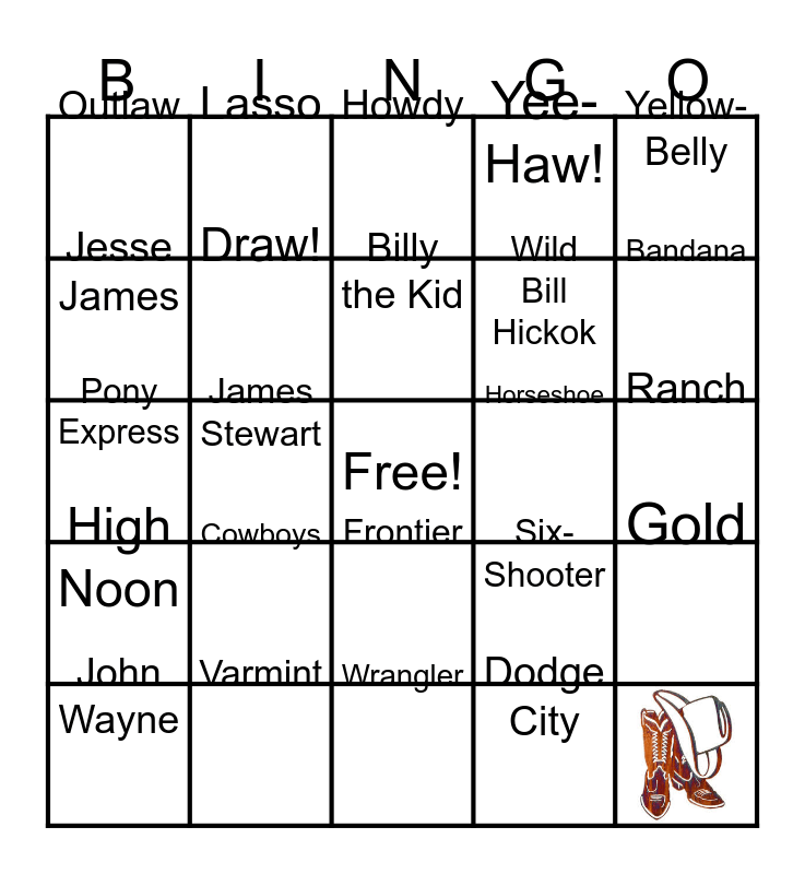 This bingo card has 3 images, a free space and 40 words: John Wayne, Clint Eastwood, Dodge City, Howdy, Tarnation, Yellow-Belly, Varmint, Yee-Haw!, Horseshoe, Frontier, Cowboys, Tombstone, Wrangler, Backslapping, Pony Express, Reckon, Bandana, Lasso, Wagon, Sheriff, Outlaw, Saloon, Ranch, Saddle, Spurs, Six-Shooter, High Noon, Poker, Gold, Holster, James Stewart, Chili, Pork & Beans, Sagebrush, Billy the Kid, Jesse James, Wild Bill Hickok, Deadwood, Draw! and Git!.