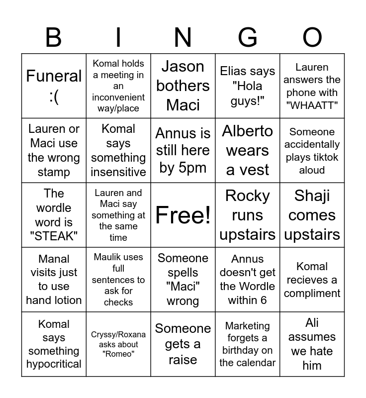 This bingo card has a free space and 38 words: Maci spills a beverage, Diem starts a conversation, Komal wears leather pants, Komal says something insensitive, Komal recieves a compliment, Maulik uses full sentences to ask for checks, Annus is still here by 5pm, Shumaila forgets something in her car, Lauren answers the phone with "WHAATT", Alberto wears a vest, Lauren and Maci say something at the same time, Elias says "Hola guys!", Ali assumes we hate him, Shaji comes upstairs, Lauren or Maci use the wrong stamp, Manal visits just to use hand lotion, Sunny comes upstairs, Jason bothers Maci, Cryssy asks Maci for coffee, Rocky runs upstairs, Funeral :(, Cryssy/Roxana asks about "Romeo", Someone accidentally plays tiktok aloud, Komal says something hypocritical, Shumaila is here before 10am, Someone gets a raise, Alberto calls someone "mortal", Zain comes up just to say "how's it going guys?", "We should all just go home", Shumaila parking in the lines, Lauren answers a random number and it's not spam, Someone spells "Maci" wrong, Marketing forgets a birthday on the calendar, Komal holds a meeting in an inconvenient way/place, A manager asks for their checks without looking in the bin, Annus doesn't get the Wordle within 6, The wordle word is "STEAK" and Hamza and Annus talk about sports.