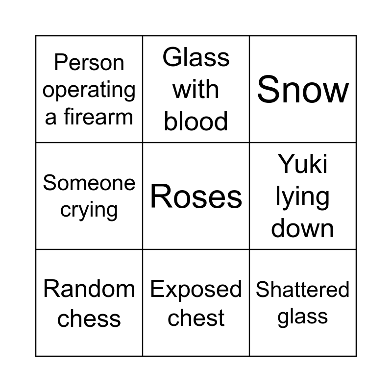 This bingo card has 9 words: Random chess, Snow, Glass with blood, Someone crying, Person operating a firearm, Yuki lying down, Roses, Shattered glass and Exposed chest.