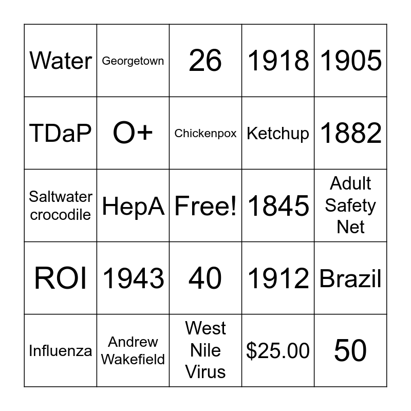 This bingo card has a free space and 24 words: 1943, Andrew Wakefield, Chickenpox, Influenza, 1905, Water, TDaP, Georgetown, 1845, 40, Ketchup, Saltwater crocodile, 1912, Brazil, O+, $25.00, Adult Safety Net, 26, 1882, HepA, 50, ROI, 1918 and West Nile Virus.