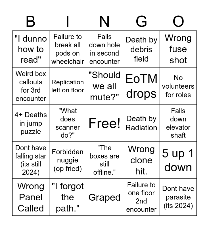 This bingo card has a free space and 24 words: Forbidden nuggie (op fried), "I forgot the path.", "Should we all mute?", Wrong Panel Called, Wrong fuse shot, "I dunno how to read", Weird box callouts for 3rd encounter, Failure to break all pods on wheelchair, Death by Radiation, "The boxes are still offline.", EoTM drops, 4+ Deaths in jump puzzle, Wrong clone hit., 5 up 1 down, Replication left on floor, Failure to one floor 2nd encounter, Falls down elevator shaft, Falls down hole in second encounter, No volunteers for roles, "What does scanner do?", Dont have parasite (its 2024), Dont have falling star (its still 2024), Death by debris field and Graped.