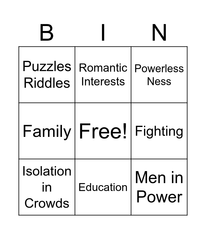 This bingo card has a free space and 11 words: Expectations, Education, Men in Power, Isolation in Crowds, Romantic Interests, Powerless Ness, Fighting, Arguments, Family, Puzzles Riddles and Book/Movie Characters.