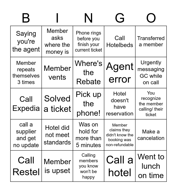 This bingo card has a free space and 27 words: Member claims they didn't know the booking was non-refundable, Member cancels bc of health, Agent error, Calling members you know won't be happy, Member repeats themselves 3 times, Phone rings before you finish your current ticket, Member asks where the money is, call a supplier and get no update, Hotel doesn't have reservation, Make a cancelation, Call Expedia, Call Hotelbeds, Call Restel, Member is upset, Urgently messaging GC while on call, Refund Request, Member vents, Where's the Rebate, Hotel did not meet standards, Saying you're the agent, You recognize the member calling/ their ticket, Call a hotel, Solved a ticket, Went to lunch on time, Was on hold for more than 5 minutes, Transferred a member and Member calls within 2 hours of their previous call.