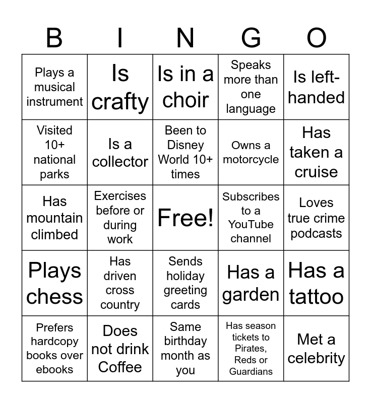 This bingo card has a free space and 54 words: Owns a horse, Plays chess, On the planning team, Has been on TV, Sends holiday greeting cards, Has been to 50 states, Speaks more than one language, Worked here 15+ Years, Visited 10+ national parks, Played sports in college, Plays a musical instrument, Ran a marathon, Does not drink Coffee, Prefers hardcopy books over ebooks, Does not have a personal cell phone, Same birthday month as you, Met a celebrity, Owns a motorcycle, Owns a record player, Loves true crime podcasts, Has a garden, Owns a boat, Subscribes to a YouTube channel, Is left-handed, Taught a class, Is crafty, Has been skydiving, Has a swimming pool, Been to Europe, Has season tickets to Pirates, Reds or Guardians, Has season tickets to Browns, Steelers or Bangals, Been to a NASCAR event, Owns a RV, Worked at the FRB less than 12 months, Is in a choir, Is a vegetarian, Has mountain climbed, Has a tattoo, Watches the Bachelor(ette), Is a collector, Walks to work, Same favorite move, Comes from a military family, Is the oldest child, Has driven cross country, Owns a bird, Has never been to the drive-in movies, Bikes to work, Been to Disney World 10+ times, Exercises before or during work, Has taken a cruise, Can do a cartwheel, Is a good cook and Has been surfing.
