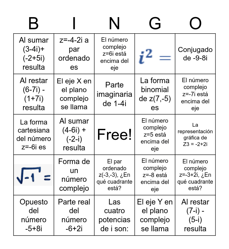 This bingo card has 2 images, a free space and 22 words: Forma de un número complejo, Parte real del número -6+2i, Parte imaginaria de 1-4i, Opuesto del número -5+8i, Conjugado de -9-8i, Al sumar (3-4i)+(-2+5i) resulta, Al restar (6-7i) - (1+7i) resulta, z=-4-2i a par ordenado es, El número complejo z=5 está encima del eje, El par ordenado z(-3,-3), ¿En qué cuadrante está?, La forma binomial de z(7,-5) es, La forma cartesiana del número z=-6i es, El número complejo z=-8 está encima del eje, El número complejo z=-3+2i, ¿En qué cuadrante está?, El eje X en el plano complejo se llama, El eje Y en el plano complejo se llama, La representación gráfica de Z3 = -2+2i, El número complejo z=6i está encima del eje, El número complejo z=-7i está encima del eje, Al sumar (4-6i) + (-2-i) resulta, Al restar (7-i) - (5-i) resulta and Las cuatro potencias de i son:.
