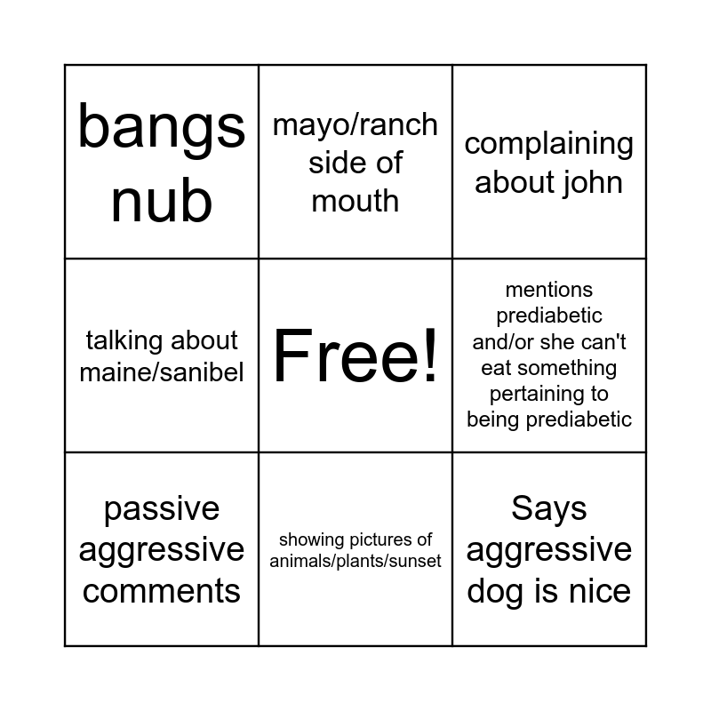 This bingo card has a free space and 8 words: mentions prediabetic and/or she can't eat something pertaining to being prediabetic, complaining about john, mayo/ranch side of mouth, passive aggressive comments, bangs nub, Says aggressive dog is nice, talking about maine/sanibel and showing pictures of animals/plants/sunset.