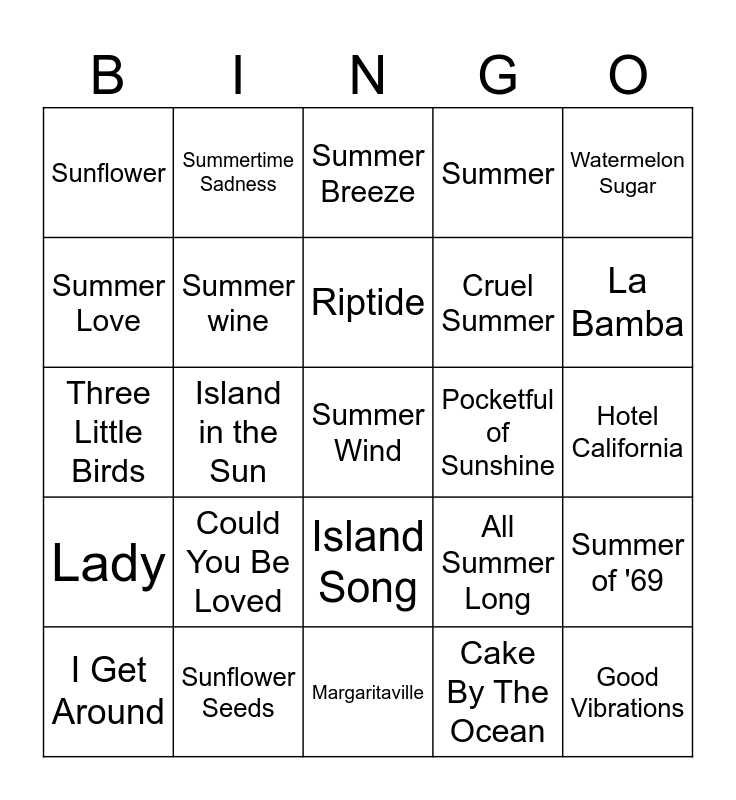 This bingo card has a free space and 44 words: Surfin' USA, Good Vibrations, California Girls, I Get Around, Toes, Cake By The Ocean, Summer Breeze, Teenage Dream, Watermelon Sugar, Sunflower Seeds, Summer, Pocketful of Sunshine, Island Song, Could You Be Loved, Over the Rainbow, Margaritaville, Jamming, Three Little Birds, Red Red Wine, La Bamba, Summertime Sadness, Sit Next to Me, Buttercup, Sunflower, Firework, Hotel California, Summer Nights, Californication, All Summer Long, Lady, Last Friday Night, Summer of '69, Party In The USA, Love Shack, Island in the Sun, Chicken Fried, Walking on Sunshine, Sugar, Riptide, Summer Love, Cruel Summer, Summerboy, Summer wine and Summertime Blues.