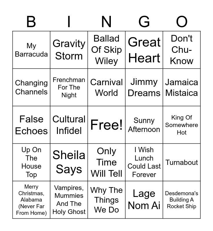 This bingo card has a free space and 75 words: Apocalypso, Baby's Gone Shoppin', Ballad Of Skip Wiley, Banana Wind, Bank Of Bad Habits, Barometer Soup, Blue Heaven Rendevous, Bob Robert's Society Band, Boomerang Love, Bring Back The Magic, Calaloo, Captain America, Carnival World, Changing Channels, Christmas Island, Cultural Infidel, Delaney Talks To Statues, Desdemona's Building A Rocket Ship, Diamond As Big As The Ritz, Don't Chu-Know, Everybody's Got A cousin In Miami, False Echoes, Frenchman For The Night, Gravity Storm, Great Heart, Happily Ever After (Now And Then), Happy Xmas (War Is Over), Ho Ho Ho And A Bottle Of Rhum, Holiday, Homemade Music, If It All Falls Down, I'll Be Home For Christmas, Island Fever, I Wish Lunch Could Last Forever, Jamaica Mistaica, Jimmy Dreams, Jingle Bells, Just An Old Truth Teller, King Of Somewhere Hot, Lage Nom Ai, L'Air De La Louisiane, Lone Palm, Love In The Library, Mele Kalikimaka, Mental Floss, Mermaid In The Night, Merry Christmas, Alabama (Never Far From Home), My Barracuda, The Night I Painted The Sky, No Plane On Sunday, Off To See The Lizard, Only Time Will Tell, Overkill, Pre-You, Prince Of Tides, Public Relations, Quietly Making Noise, Remittance Man, Run Rudolph Run, A Sailor's Christmas, Sheila Says, She's Got You, Six String Magic, Smart Woman (In A Real Short Skirt), Strange Bird, Sunny Afternoon, Take Another Road, That's My Story And I'm Stickin' To It, That's What Living Is To Me, Turnabout, Up On The House Top, Vampires, Mummies And The Holy Ghost, When The Coast Is Clear, Why The Things We Do and You'll Never Work In Dis Bidness Again.