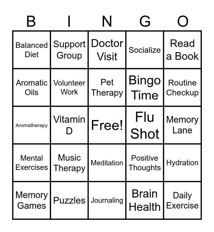This bingo card has a free space and 45 words: Healthy Snacks, Daily Exercise, Deep Breathing, Memory Games, Stay Hydrated, Brain Health, Doctor Visit, Medication Reminder, Read a Book, Puzzles, Socialize, Flu Shot, Meditation, Music Therapy, Mental Health, Journaling, Laughter, Aromatherapy, Creative Hobby, Routine Checkup, Support Group, Stretching, Good Night’s Sleep, Balanced Diet, Brain Teasers, Memory Lane, Favorite Song, Relaxation, Positive Thoughts, Mental Exercises, Nature Walk, Hydration, Write a Letter, Yoga Class, Call a Friend, Vitamin D, Fresh Air, Learn Something New, Warm Bath, Pet Therapy, Aromatic Oils, Bingo Time, Healthy Habits, Volunteer Work and Peace of Mind.