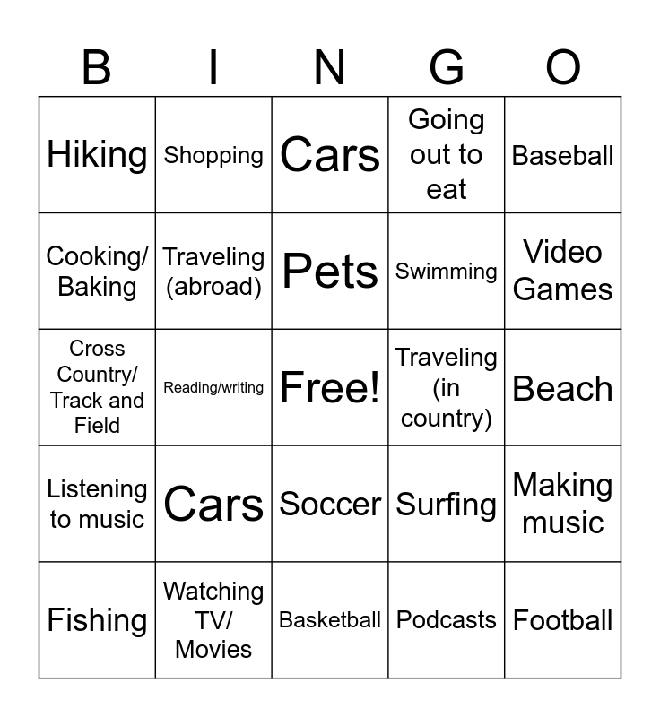 This bingo card has a free space and 24 words: Cars, Watching TV/ Movies, Pets, Fishing, Baseball, Hiking, Cooking/ Baking, Shopping, Traveling (in country), Soccer, Swimming, Cross Country/ Track and Field, Surfing, Making music, Traveling (abroad), Podcasts, Beach, Cars, Video Games, Reading/writing, Football, Listening to music, Going out to eat and Basketball.