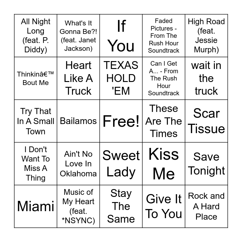 This bingo card has a free space and 148 words: Believe, No Scrubs, Angel Of Mine, Heartbreak Hotel (feat. Faith Evans & Kelly Price), ...Baby One More Time, Kiss Me, Genie in a Bottle, Every Morning, Nobody's Supposed to Be Here, Livin' la Vida Loca, Where My Girls At, If You Had My Love, Slide, Have You Ever, I Want It That Way, I'm Your Angel (with Céline Dion), All Star, Angel, Smooth (feat. Rob Thomas), Unpretty, Bills Bills Bills, Save Tonight, Last Kiss, Fortunate, All I Have to Give, Bailamos, What's It Gonna Be?! (feat. Janet Jackson), What It's Like, Fly Away, Someday, Lately, That Don't Impress Me Much, Wild Wild West (feat. Dru Hill & Kool Mo Dee) - Album Version With Intro, Scar Tissue, Heartbreaker (feat. Jay-Z), I Still Believe, The Hardest Thing, Summer Girls, Can I Get A... - From The Rush Hour Soundtrack, Jumper - 1998 Edit, Doo Wop (That Thing), Mambo No. 5 (A Little Bit of...), Sweet Lady, It's Not Right But It's Okay, (God Must Have Spent) A Little More Time On You - Remix, Lullaby, Anywhere, Tell Me It's Real, Back 2 Good, 808, She's so High, She's All I Ever Had, Miami, Hands, Who Dat, Please Remember Me, From This Moment On, Love Like This, You, Trippin', If You, Ex-Factor, Give It To You, Black Balloon, Spend My Life With You, These Are The Times, I Don't Want To Miss A Thing, I Do (Cherish You), Because Of You, I Will Remember You, Happily Ever After, My Love Is Your Love, All Night Long (feat. P. Diddy), Back That Azz Up, Almost Doesn't Count, Man! I Feel Like A Woman!, Steal My Sunshine, I Need to Know, So Anxious, Faded Pictures - From The Rush Hour Soundtrack, Back At One, When a Woman's Fed Up, How Forever Feels, Amazed, Sometimes, Ghetto Cowboy, Out Of My Head, Hard Knock Life (Ghetto Anthem), Jamboree (feat. Zhané), Stay The Same, Lesson In Leavin', Iris, Satisfy You (feat. R. Kelly), Better Days (And the Bottom Drops Out), Music of My Heart (feat. *NSYNC), Write This Down, When You Believe - from The Prince of Egypt, God Must Have Spent a Little More Time on You (feat. *NSYNC), I Had Some Help (Feat. Morgan Wallen), Pour Me A Drink (Feat. Blake Shelton), Austin, Rich Men North of Richmond, Thinkin’ Bout Me, Something in the Orange, Cowgirls (feat. ERNEST), Fast Car, Last Night, Dirt Cheap, I Am Not Okay, We Ride, Oklahoma Smokeshow, Where the Wild Things Are, Pretty Little Poison, Heart Like A Truck, Ain't No Love In Oklahoma, Nine Ball, wait in the truck, Pink Skies, Rock and A Hard Place, High Road (feat. Jessie Murph), The Door, Try That In A Small Town, Wildflowers and Wild Horses, Fall in Love, TEXAS HOLD 'EM, Watermelon Moonshine, Save Me (with Lainey Wilson), She Had Me At Heads Carolina, Tennessee Orange, Wind Up Missin' You, Sweet Dreams, Son Of A Sinner, Bulletproof, Dancin’ In The Country, Wild as Her, Devil You Know, White Horse, Next Thing You Know, Where It Ends, The Kind of Love We Make, Thank God, Spin You Around (1/24), Just Like Johnny, What My World Spins Around, Sun to Me, Burn It Down, Sleeping on the Blacktop and Wine Into Whiskey.