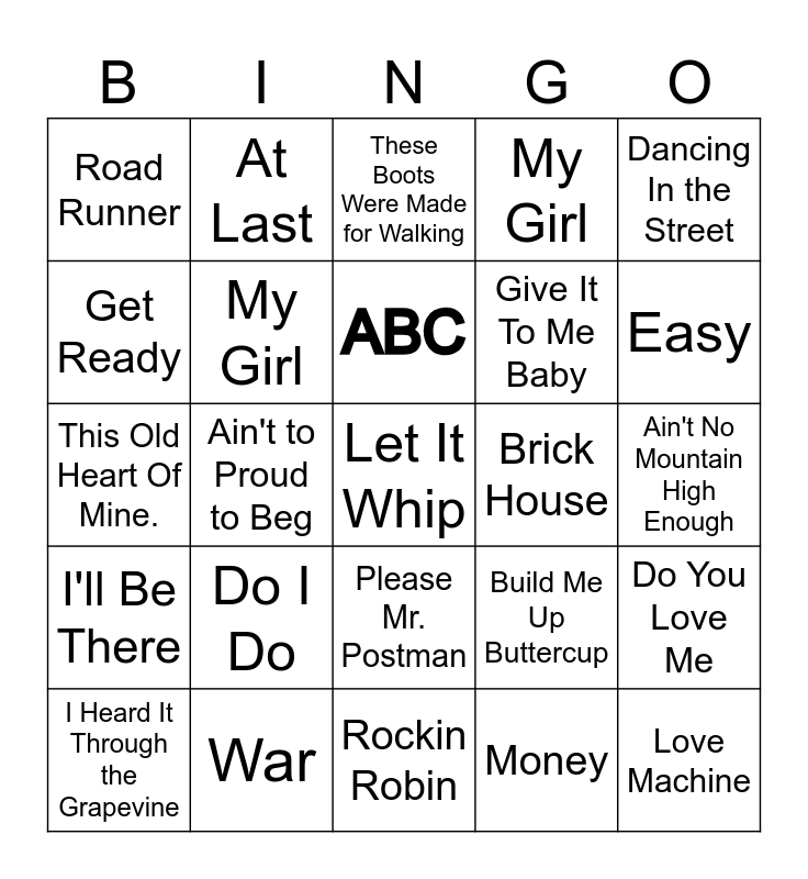 This bingo card has a free space and 39 words: I Want You Back, I Cant Help Myself, Heat Wave, My Girl, I Heard It Through the Grapevine, Please Mr. Postman, ABC, My Guy, Dancing In the Street, I'll Be There, Ain't to Proud to Beg, My Girl, Love Machine, Ain't No Mountain High Enough, Brick House, Do I Do, Superstition, Road Runner, Respect, Build Me Up Buttercup, Get Ready, Rockin Robin, Give It To Me Baby, Easy, Lets Get It On, Just My Immagination, Where Did Our Love Go, Midnight Train To Georgia, Papa Was A Rolling Stone, At Last, Whats Going On, Signed Sealed Delivered, These Boots Were Made for Walking, War, Money, Baby Love, Do You Love Me, This Old Heart Of Mine. and Upside Down.