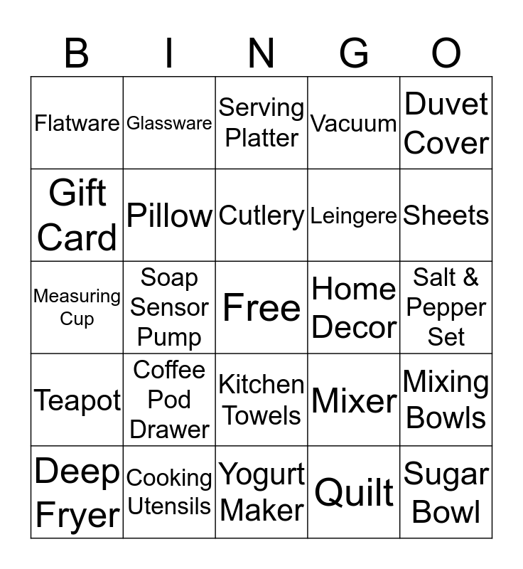 This bingo card has a free space and 24 words: Coffee Pod Drawer, Cooking Utensils, Cutlery, Deep Fryer, Duvet Cover, Flatware, Gift Card, Glassware, Home Decor, Kitchen Towels, Leingere, Measuring Cup, Mixer, Mixing Bowls, Pillow, Quilt, Salt & Pepper Set, Serving Platter, Sheets, Soap Sensor Pump, Sugar Bowl, Teapot, Vacuum and Yogurt Maker.