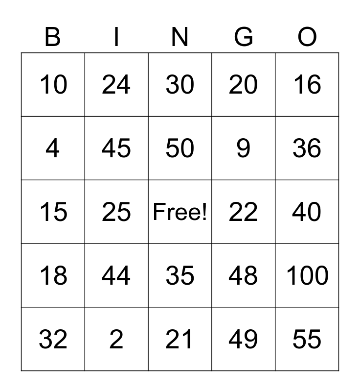 This bingo card has a free space and 34 words: 27, 49, 80, 12, 18, 45, 16, 32, 24, 28, 50, 30, 56, 14, 22, 36, 2, 15, 44, 48, 35, 6, 10, 40, 21, 55, 20, 90, 9, 4, 8, 25, 100 and 42.
