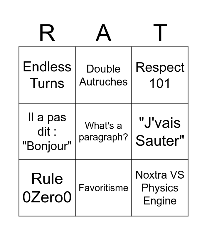 This bingo card has a free space and 8 words: "J'vais Sauter", Respect 101, Double Autruches, Rule 0Zero0, Endless Turns, Noxtra VS Physics Engine, Il a pas dit : "Bonjour" and Favoritisme.