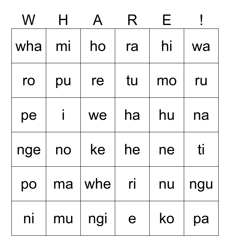 This bingo card has 54 words: a, ha, ka, ma, na, pa, ra, ta, wa, nga, wha, e, he, ke, me, ne, pe, re, te, we, nge, whe, i, hi, ki, mi, ni, pi, ri, ti, wi, ngi, whi, o, ho, ko, mo, no, po, ro, to, wo, who, u, hu, ku, mu, nu, pu, ru, tu, wu, ngu and whu.